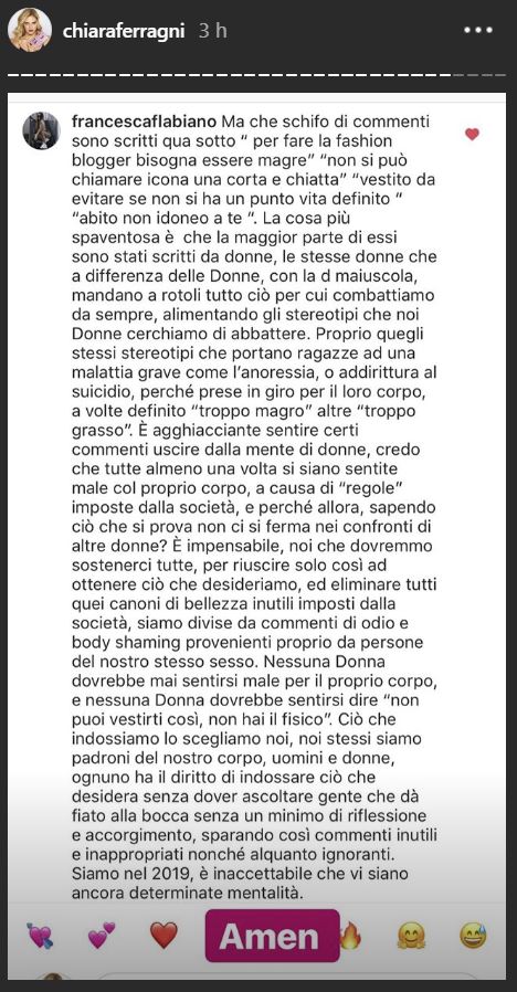 Chiara Ferragni pubblica il lungo post della ragazza in una delle sue stories e sotto commenta “Amen”. Nelle stories successive, però, affronta lei stessa il problema, parlando alle sue follower e dicendo quello che pensa del problema degli insulti sul web alle donne.