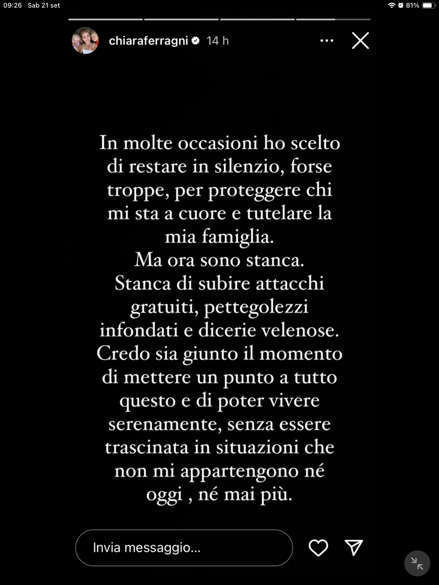 L’influencer, quindi, ha espresso tutto il suo sdegno: “In molte occasioni ho scelto di restare in silenzio, forse troppe, per proteggere chi mi sta a cuore e tutelare la mia famiglia. Ma ora sono stanca”.
