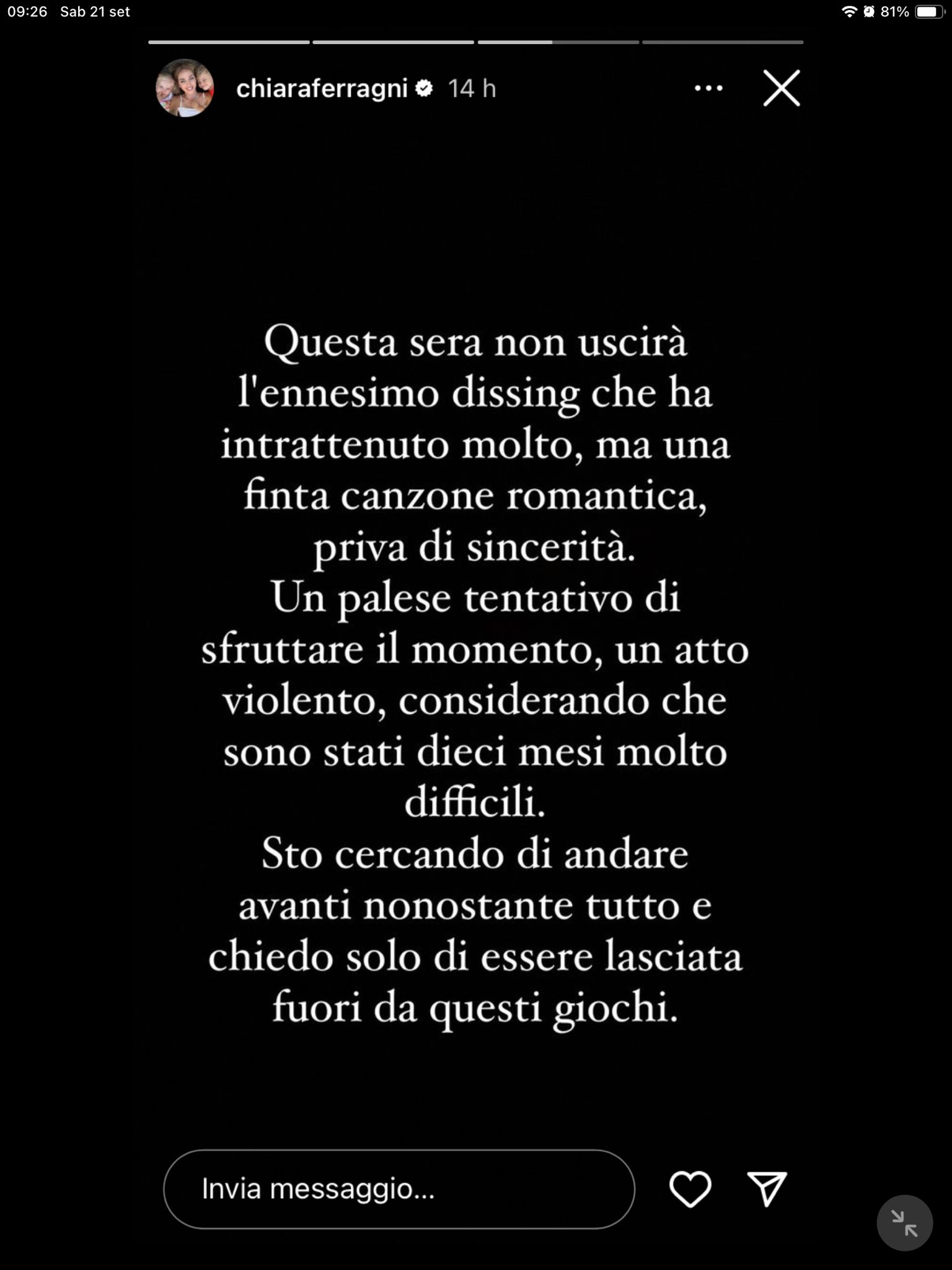 “Questa sera non uscirà l’ennesimo dissing che ha intrattenuto molto, ma una finta canzone romantica, priva di sincerità. Un palese tentativo di sfruttare il momento, un atto violento, considerando che sono stati dieci mesi molto difficili – ha scritto Chiara Ferragni – Sto cercando di andare avanti nonostante tutto e chiedo solo di essere lasciata fuori da questi giochi”.