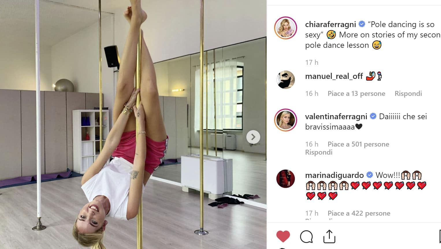 Chiara Ferragni è alla sua seconda lezione di pole dance, e ha subito postato le foto dell’esibizione su Instagram, non appena uscita dalla scuola di ballo.