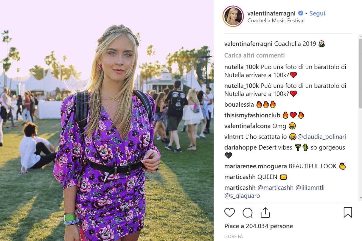 Il motivo, forse, è del tutto familiare. La bella Chiara non ha perso tempo infatti a condividere nelle sue storie Instagram lo scatto di sua sorella, Valentina, al Coachella 2019. “Seguite lei”, ha suggerito la Ferragni, taggando il profilo della sorella.