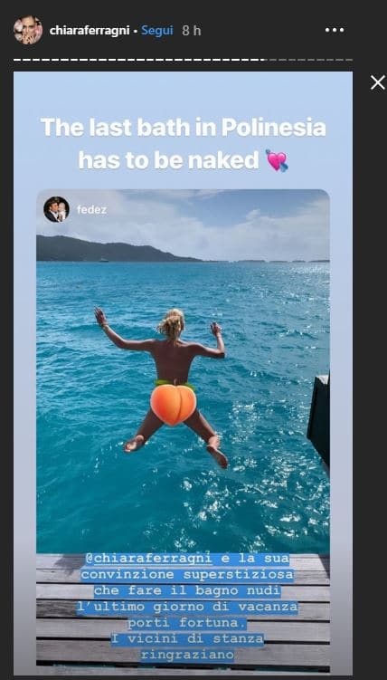 Chiara Ferragni ha salutato la Polinesia con un bagno nuda: la blogger, in vacanza al Four Season di Bora Bora insieme a Fedez, si è tuffata in mare senza costume. È stato il marito stesso a pubblicare una story sul suo profilo Instagram per testimoniare l’impresa.