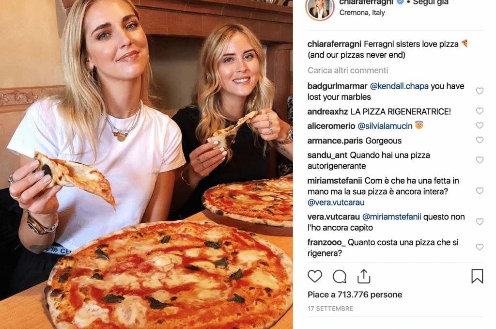 Insomma, non era stata presa benissimo. Gli utenti si sono sentiti un po’ presi in giro dalla faccenda della pizza e lei, per stemperare, qualche tempo dopo aveva postato un’altra foto, in compagnia della sorella Valentina, in cui entrambe avevano uno spicchio di pizza in mano e davanti pizze integre. “Le sorelle Ferragni amano la pizza (che non finisce mai)”, scriveva Chiara Ferragni.