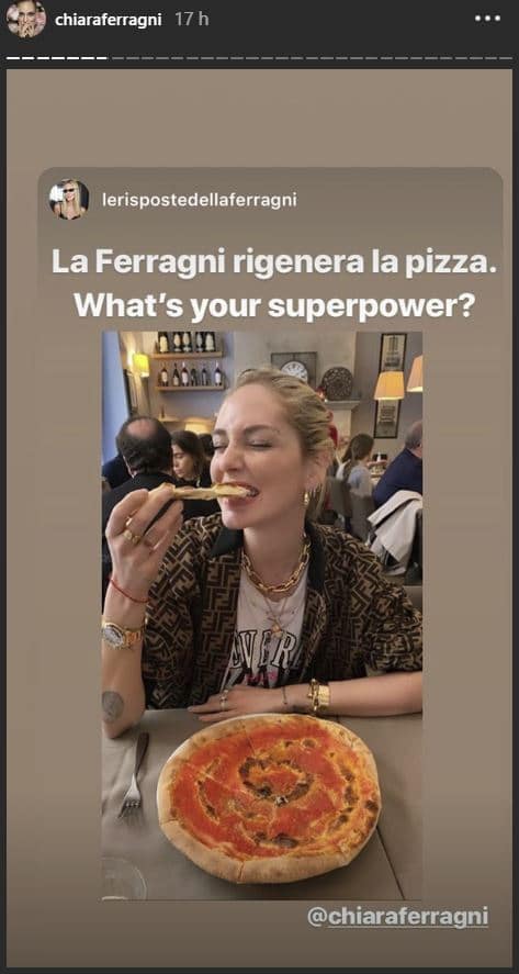 Ironizza sulla faccenda, la Ferragni, che nella storia successiva pubblica la foto dell’account Instagram “Le risposte di Chiara Ferragni”, in cui si legge: “La Ferragni rigenera pizza. Quale è il tuo superpotere?”.