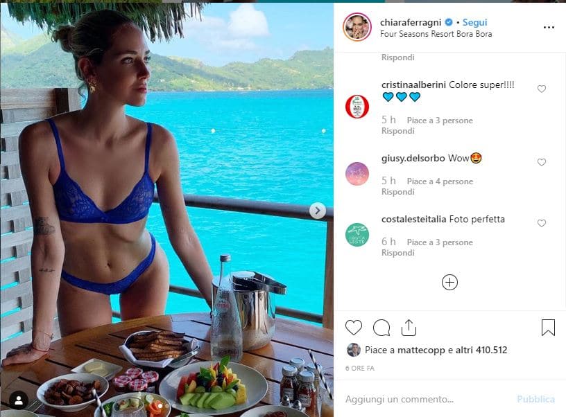 Da ultimo, la blogger cremonese è stata duramente bersagliata per una foto in costume in cui è in evidenza tutta la sua magrezza: la Ferragni indossa un bikini di Intimissimi (brand di lingerie taggato nella foto come adversitising) e guarda all’orizzonte il mare turchese di fronte al resort Four Season di Bora Bora.