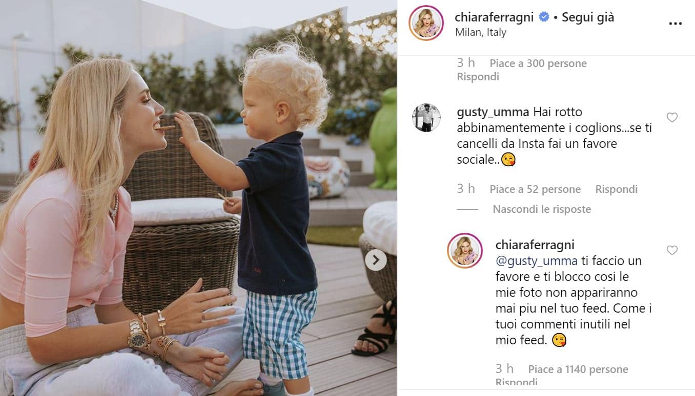 La maggior parte dei follower hanno salutato le foto di Chiara Ferragni e Leone con dolcezza e simpatia, apprezzando l’affetto materno che unisce i due. A un certo, punto, però, spunta un commento che proprio non deve esser piaciuto a mamma Chiara.