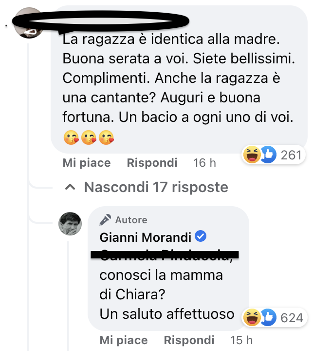 Fin qui nulla di strano se non fosse che tra i numerosi commenti ne è apparso uno di una signora, che evidentemente non conosce Chiara Ferragni, la quale, rivolgendosi a Gianni Morandi, ha scritto: “La ragazza è identica alla madre. Buona serata a voi. Siete bellissimi. Complimenti. Anche la ragazza è una cantante? Auguri e buona fortuna. Un bacio a ogni uno di voi”.