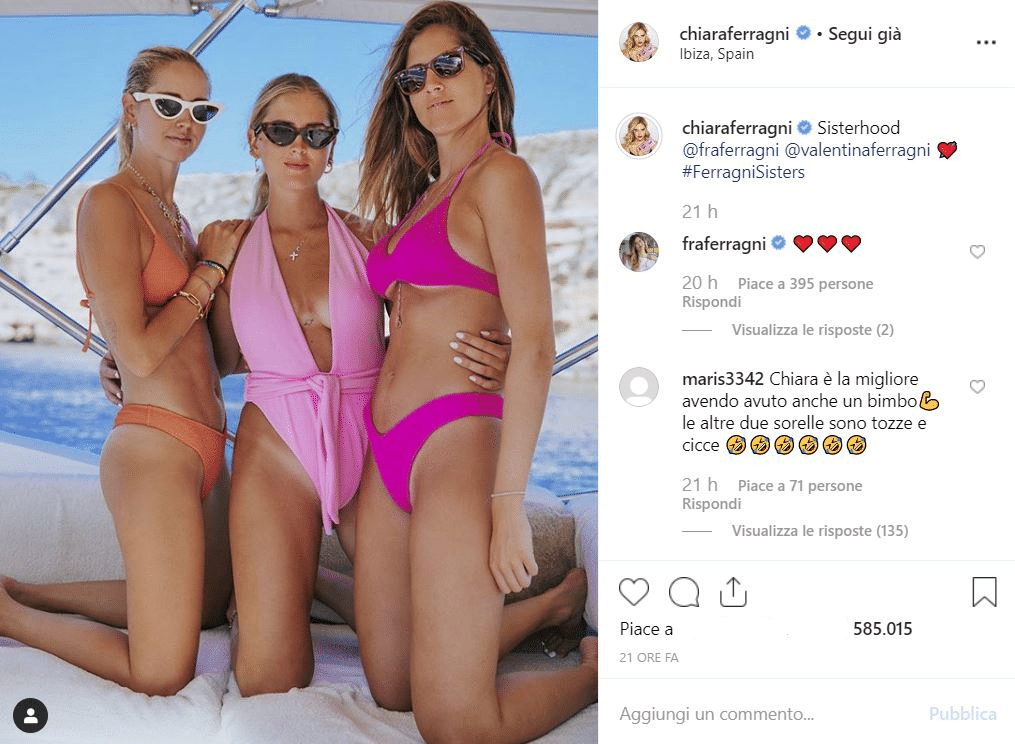 Sotto al post si moltiplicano i commenti in cui tanti followers si complimentano con le tre, ma a un certo punto spunta un commento negativo nei confronti delle tre: “Chiara è la migliore avendo avuto anche un bimbo, le altre due sorelle sono tozze e cicce”.
