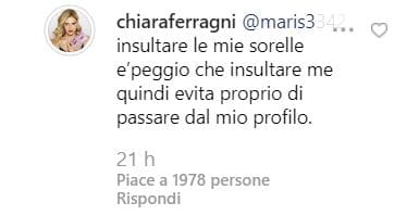 Tozze e cicce, scrive un utente senza volto sotto alla foto di una Chiara Ferragni che diventa una furia quando le toccano le sorelle. Sotto al commento negativo, si moltiplicano quelli di chi si erge in difesa delle sorelle Ferragni. Poi, all’improvviso, arriva la risposta della fashion blogger. Di solito Chiara Ferragni evita di rispondere alle provocazioni e lascia correre: è difficile che risponda anche ai commenti più pesanti sul suo conto.