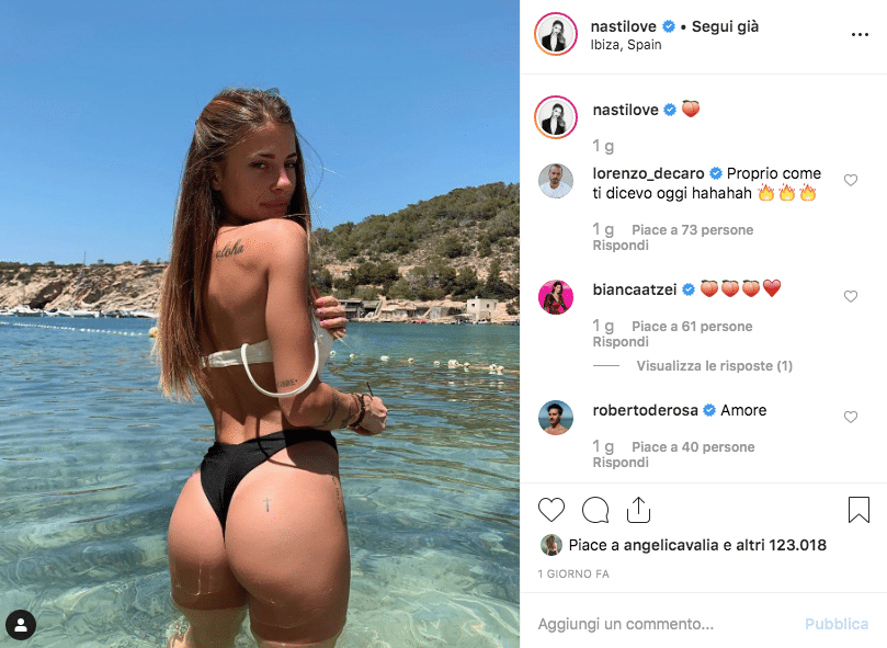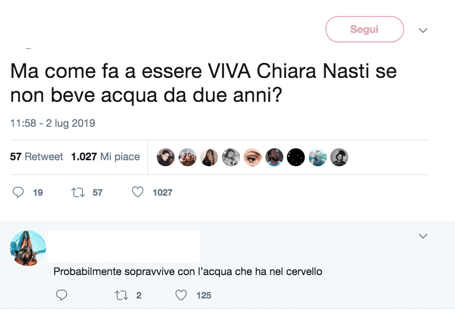 La 21enne, nella sua ultima foto Instagram in costume, ha scritto un commento che ha attirato molte critiche. Nel post Chiara Nasti scrive di non bere acqua da due anni “non è di mio gradimento, bevo solo acqua di cocco e coca-cola” in risposta a sua follower che le chiedeva un rimedio per contrastare la cellulite.