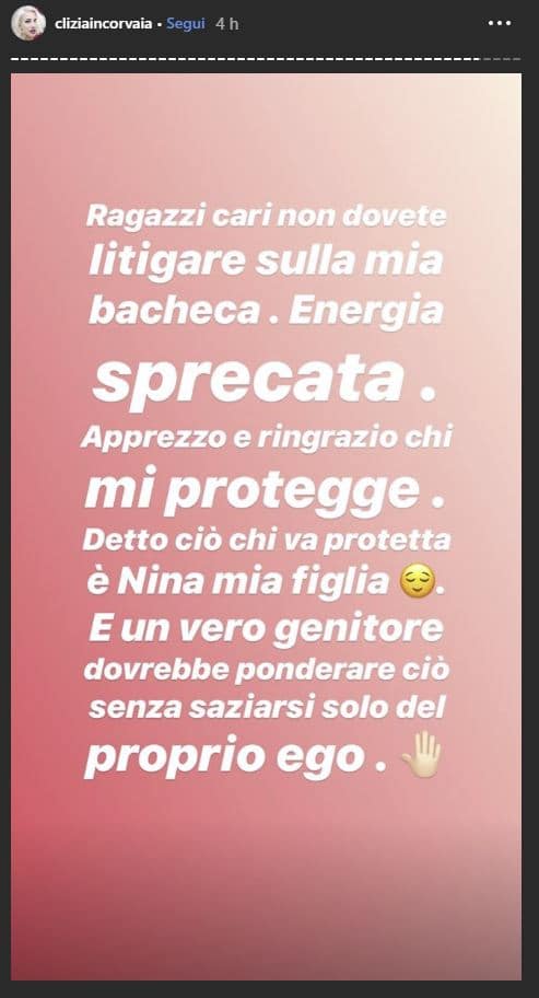 “L’ho sempre amato e rispettato. Apprezzo e ringrazio chi mi protegge. Detto ciò, chi va protetta è mia figlia Nina. E un vero genitore dovrebbe ponderare ciò, senza saziarsi del proprio ego”, scrive ancora Clizia.