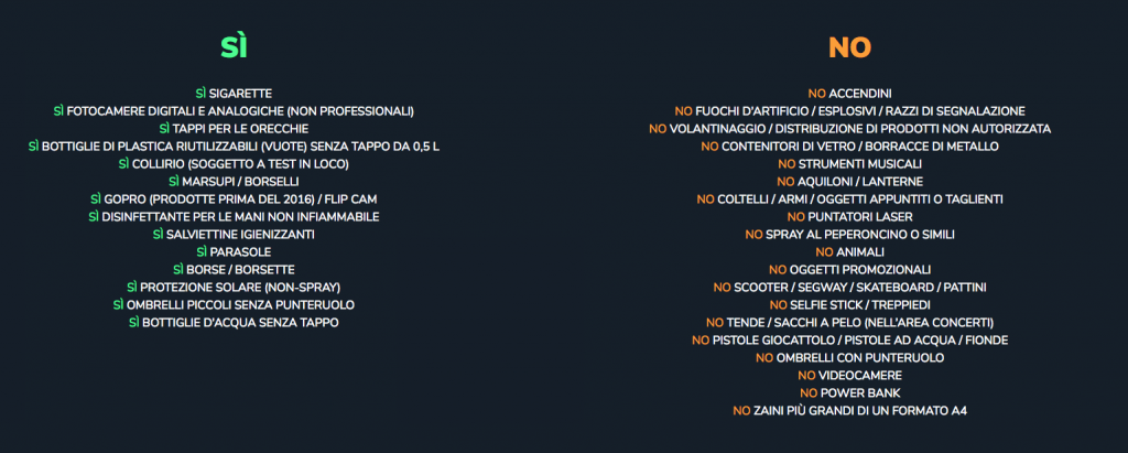 Per non rischiare di introdurre oggetti pericolosi, che poi verranno sequestrati all’ingresso, ecco un elenco di tutto ciò che è consentito introdurre nell’Area Expo del festival: