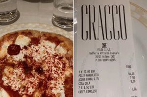 Per tre pizze, un’acqua, una coca e due caffè il napoletano ha speso 82 euro. Il prezzo della pizza margherita di Cracco è quindi salito da 16 a 20 euro.