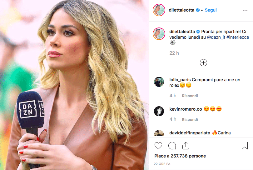 “Pronta per ripartire! Ci vediamo lunedì su @dazn_it #interlecce“. Torna la Serie A e Diletta Leotta è più carica che mai. La bella conduttrice siciliana, dopo le vacanze, è pronta a tornare in pista con DAZN, emittente che nella serata di lunedì trasmetterà Inter-Lecce.