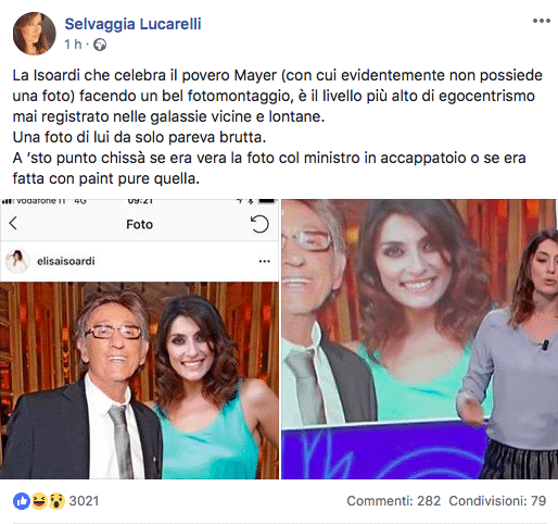 Anche l’opinionista Selvaggia Lucarelli ha commentato la scelta della Isoardi di pubblicare quella foto, e in un post Facebook scrive: “La Isoardi che celebra il povero Mayer (con cui evidentemente non possiede una foto) facendo un bel fotomontaggio, è il livello più alto di egocentrismo mai registrato nelle galassie vicine e lontane. Una foto di lui da solo pareva brutta.  A ‘sto punto chissà se era vera la foto col ministro in accappatoio o se era fatta con paint pure quella”.