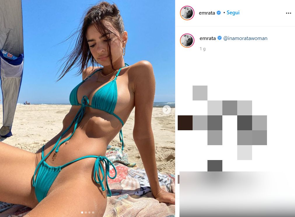 Siamo ormai abituati alle stravaganze di Emily Ratajkowski, la top-model se ne inventa sempre una più del diavolo per dare scalpore soprattutto sui social e non è da meno l’ultima fotografia pubblicata sul proprio account, un primo piano da urlo (e quasi da censura). La bella modella americana si sta godendo le vacanze al mare in questo periodo e, direttamente dalla spiaggia, consegna ai suoi follower uno scatto che potrebbe essere tranquillamente vietato ai minori. Seduta sulla sabbia, la Ratajkowski indossa un bikini verde acqua. A catturare l’occhio è lo slip striminzito, risaltato dal primo piano della fotografia, che lascia ben poco all’immaginazione.