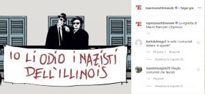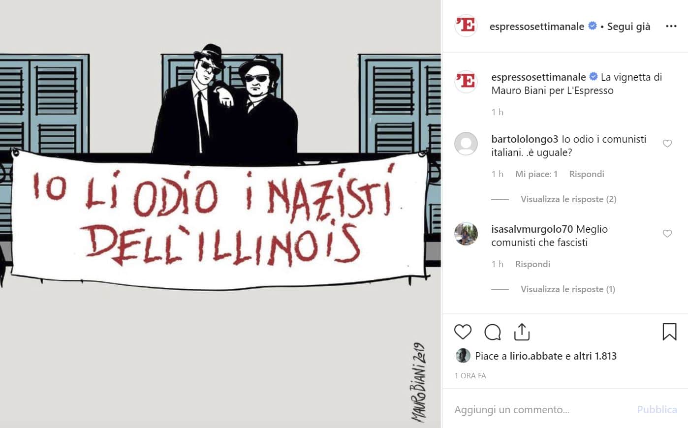 Si rifà al film The Blues Brothers e riprende una delle sue citazioni più celebri per dipingere quella che è, a suo modo di vedere, l’Italia post voto. Nella vignetta si legge “Io li odio i nazisti dell’Illinois” e la scritta compare su uno striscione attaccato sulla facciata di un palazzo.