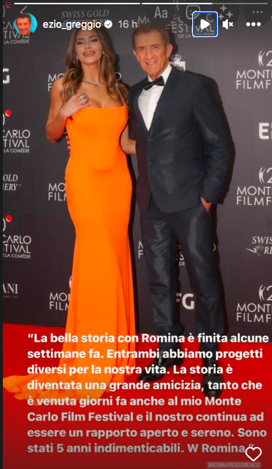 Ad annunciarlo ufficialmente è Greggio su Instagram: “La bella storia con Romina è finita alcune settimane fa. Entrambi abbiamo progetti diversi per la nostra vita”. Non è stato un doloroso addio, ma un rapporto trasformato in qualcosa di altrettanto bello, spiega il conduttore: “La storia è diventata una grande amicizia, tanto che è venuta giorni fa al mio Monte Carlo Film Festival e il nostro continua a essere un rapporto aperto e sereno. Sono stati 5 anni indimenticabili. W Romina”. Le stesse parole sono apparte tra le ig storie della speaker, che conclude: “W Ezio”.