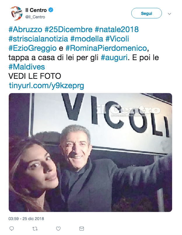 A riportare la notizia è stato il quotidiano locale Il Centro che in un articolo racconta: “Una toccata e fuga a Vicoli per fare gli auguri di Natale a genitori e fratelli prima di partire, senza disdegnare una cena con i piatti tipici abruzzesi in un ristorante di Carpineto della Nora. Direzione Maldive per il noto attore comico e conduttore televisivo Ezio Greggio e per la sua nuova compagna Romina Pierdomenico, modella pescarese divenuta famosa nel 2012, quando arrivò al secondo posto nel concorso nazionale di Miss Italia”.