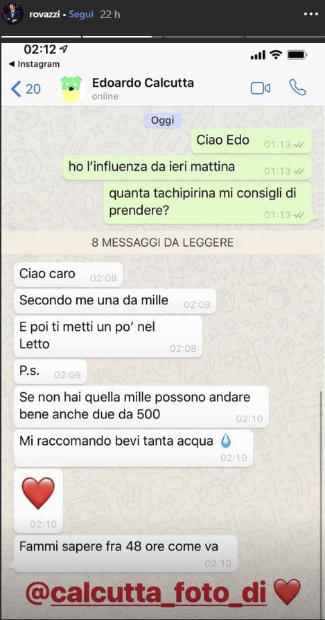 Sul suo account Instagram, lo Youtuber pubblica due stories: nella prima, a sfondo nero, Rovazzi scrive un messaggio semplice e diretto: “Ho l’influenza :)”. In quella successiva, l’artista di 25 anni pubblica lo screenshot di una conversazione di WhatsApp. Dall’altra parte del telefono c’è il cantautore pontino Calcutta.