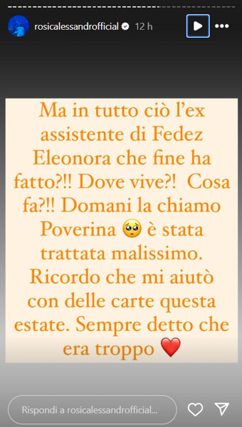 In una stories pubblicata sul suo profilo Instagram, infatti, Rosica definisce Eleonora Sesana “ex assistente” del cantante: “Ma in tutto ciò l’ex assistente di Fedez Eleonora che fina ha fatto? Dove vive? Cosa fa? Poverina è stata trattata malissimo” scrive l’esperto di gossip.