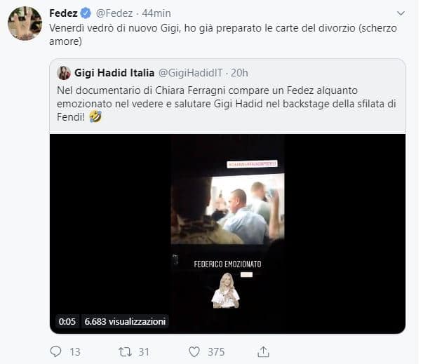 “Venerdì vedrò di nuovo Gigi, ho già preparato le carte del divorzio (scherzo amore)”, è il tweet con cui il rapper Fedez annuncia che venerdì prossimo rivedrà la sua modella preferita Gigi Hadid, che ha incontrato anche davanti alle telecamere del documentario Chiara Ferragni Unposted, nelle sale italiane dal 17 al 19 settembre.