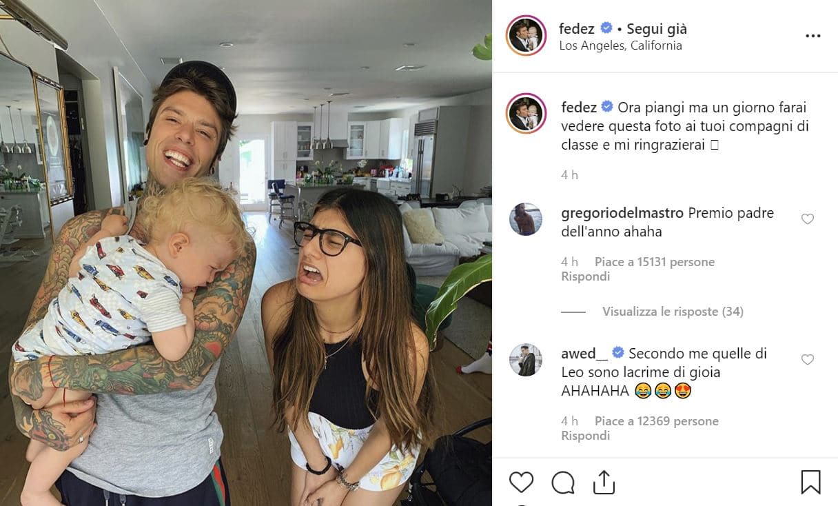 Accanto allo scatto, Fedez scrive: “Ora piangi ma un giorno farai vedere questa foto ai tuoi compagni di classe e mi ringrazierai”. Per chi non lo sapesse, Mia Khalifa è una ex pornostar. Per questo il rapper ironizza sul fatto che Leone capirà solo quando diventerà un ometto la fortuna che ha avuto incontrando Mia.