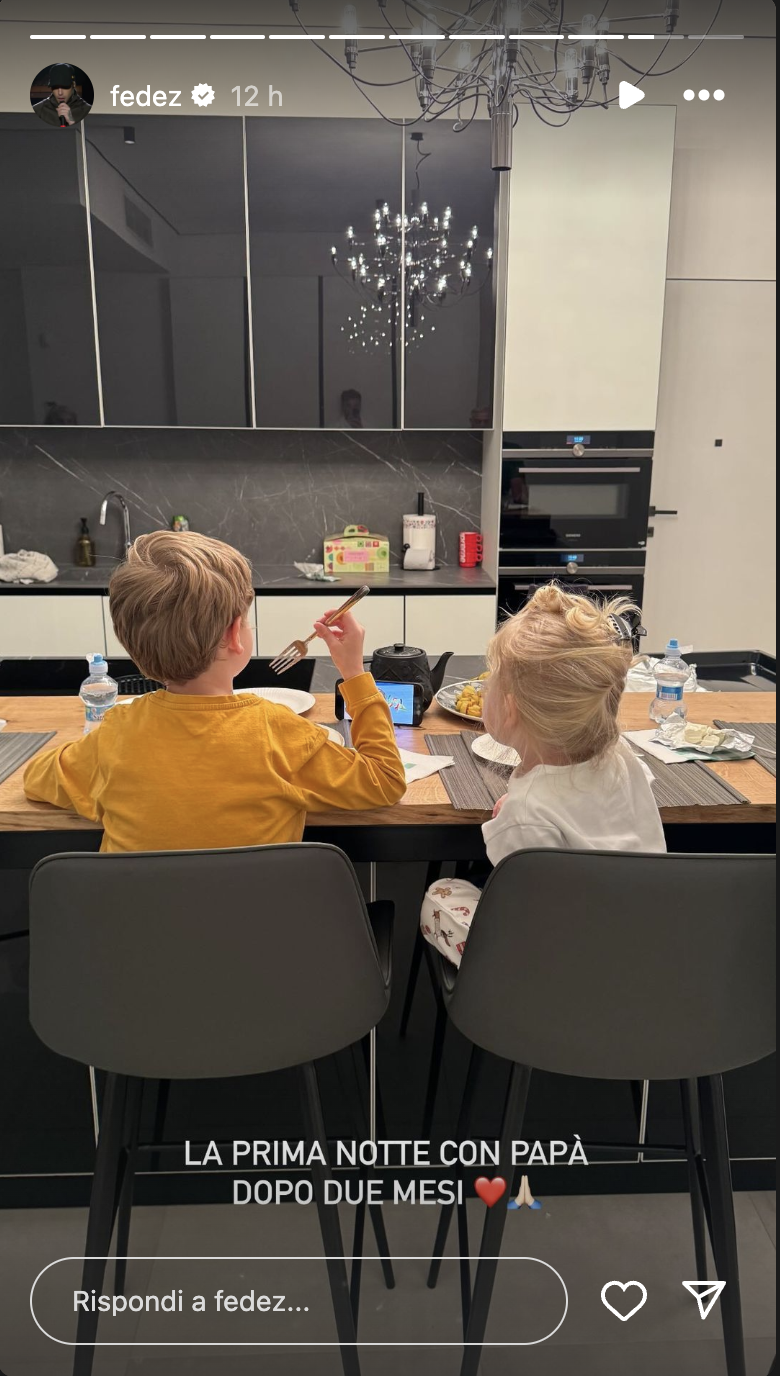 “La prima notte con papà dopo due mesi” ha scritto il cantante in una foto postata tra le stories del suo profilo Instagram in cui si vedono i due bimbi di spalle mentre cenano nella nuova casa del rapper.