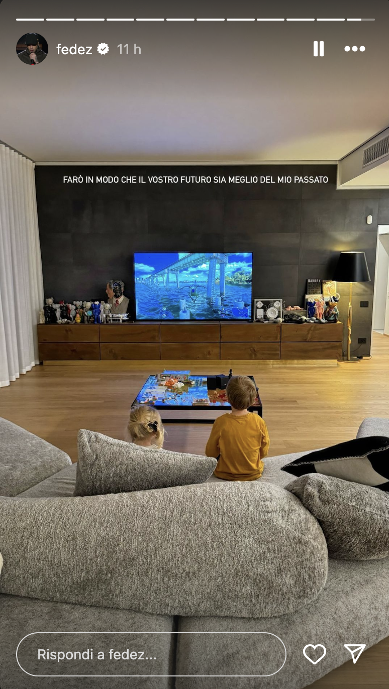 Successivamente, Fedez ha postato un’altra foto in cui Leone e Vittoria sono ritratti, sempre di spalle, mentre guardano la tv in salotto.