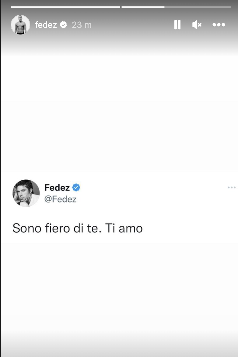 Subito dopo, in una stories, ha pubblicato un suo tweet risalente al 7 febbraio scorso e scritto in occasione del monologo proposto da Chiara Ferragni nella prima puntata di Sanremo 2023, in cui si legge: “Sono fiero di te. Ti amo”.