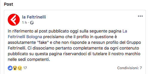 Il testo apparso sulla pagina Facebook fake della Feltrinelli di Bologna