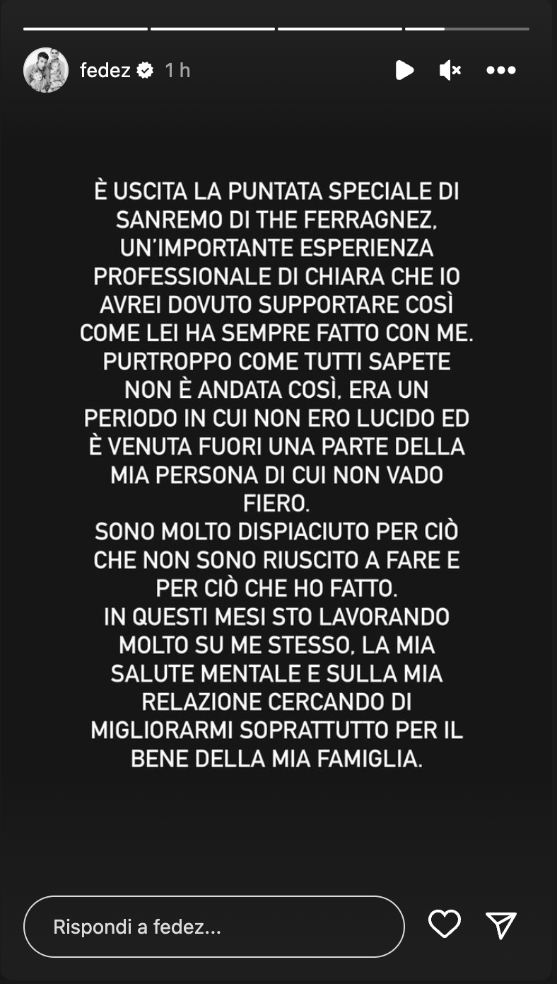 “È uscita la puntata speciale di Sanremo di The Ferragnez – ha scritto il cantante – Un’importante esperienza professionale di Chiara che io avrei dovuto supportare così come lei ha sempre fatto con me”.