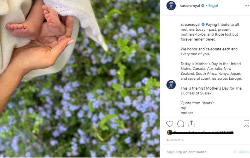 Sul profilo ufficiale dei Duchi di Sussex è stato pubblicato un post di auguri dedicato a tutte le mamme del mondo che, in neanche un’ora, ha raggiunto quasi 500 mila like: “Un omaggio a tutte le madre, di ieri, oggi e quelle che verranno, e anche quelle che non ci sono più ma che saranno sempre ricordate.