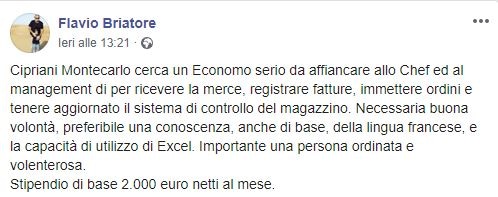 Stipendio di base 2.000 euro netti al mese”, si legge nell’annuncio postato su Facebook dall’imprenditore.