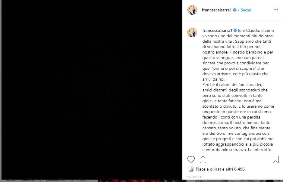 La coppia, che si è sposata nel novembre 2017 negli Stati Uniti, stava aspettando il primo figlio insieme: “Il nostro bimbo, tanto cercato, tanto voluto, che finalmente era dentro di me contagiandoci con gioie e progetti e con cui poi abbiamo lottato aggrappandoci alla più piccola e improbabile speranza, ha interrotto il suo cammino prematuramente lasciando un vuoto che non riusciamo a riempire con nulla”.