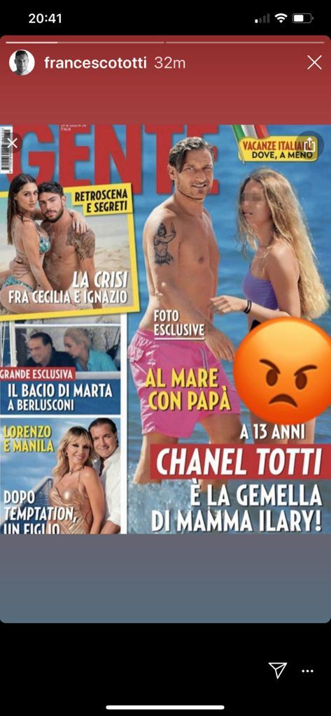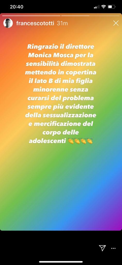 “Ringrazio il direttore Monica Mosca per la sensibilità dimostrata mettendo in copertina il lato B di mia figlia minorenne senza curarsi del problema sempre più evidente della sessualizzazione e mercificazione del corpo delle adolescenti”, così Francesco Totti su Instagram dopo la pubblicazione del lato B di sua figlia Chanel sulla copertina del settimanale Gente.