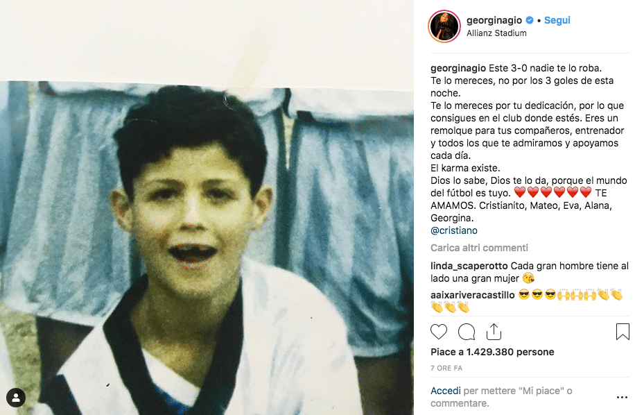 “Questo 3-0 non te lo può togliere. Te lo meriti, non per i 3 gol di stasera. Te lo meriti per la tua dedizione, per ciò che fai per la squadra”, ha scritto la modella spagnola sul suo profilo Instagram accanto a una foto di CR7 da bambino.