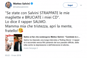 Il rapper italiano parla del ministro dell'Interno e commenta le dichiarazioni dell'artista Salmo