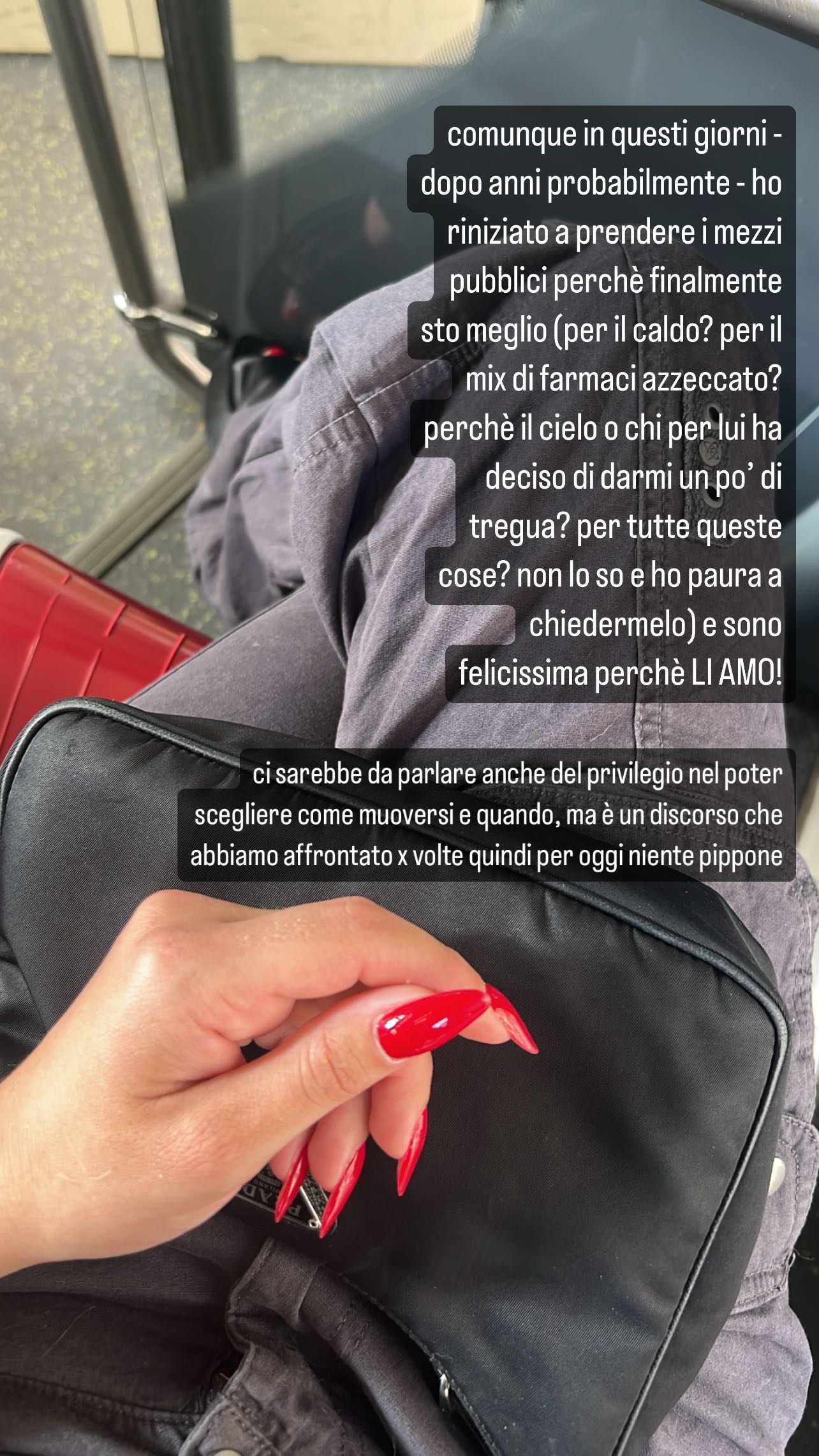 “In questi giorni – scrive Giorgia Soleri – dopo anni probabilmente ho iniziato a prendere i mezzi pubblici perchè finalmente sto meglio (per il caldo? per il mix di farmaci azzecato? perchè il cielo o chi per lui ha deciso di darmi tregua? per tutte queste cose? non lo so e ho paura a chiedermelo)”.
