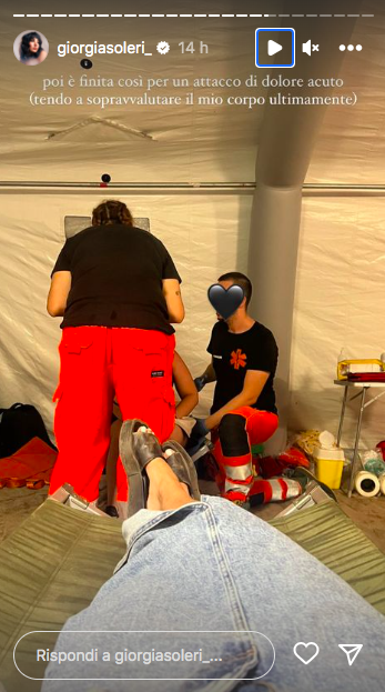 Infatti, nelle stories ecco i soccorsi e un suo scatto nella zona degli interventi dello staff medico. La Soleri, infatti, ha avuto un malore: “Un attacco di dolore acuto. Tendo a sopravvalutare il mio corpo ultimamente”, ha spiegato.