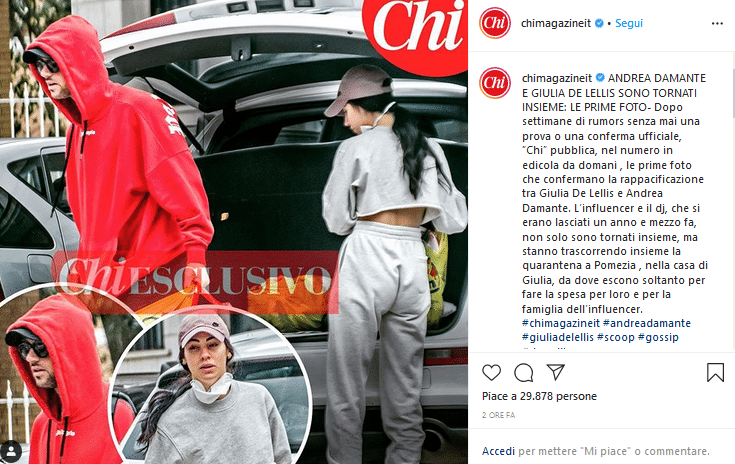 Le foto sono state pubblicate sull’account ufficiale Instagram di Chi come anteprima di quello che verrà mostrato nel prossimo settimanale, disponibile da domani in edicola. Nella didascalia del post si legge: “Dopo settimane di rumors senza mai una prova o una conferma ufficiale, “Chi” pubblica, nel numero in edicola da domani , le prime foto che confermano la rappacificazione tra Giulia De Lellis e Andrea Damante. L’influencer e il dj, che si erano lasciati un anno e mezzo fa, non solo sono tornati insieme, ma stanno trascorrendo insieme la quarantena a Pomezia, nella casa di Giulia, da dove escono soltanto per fare la spesa per loro e per la famiglia dell’influencer”.