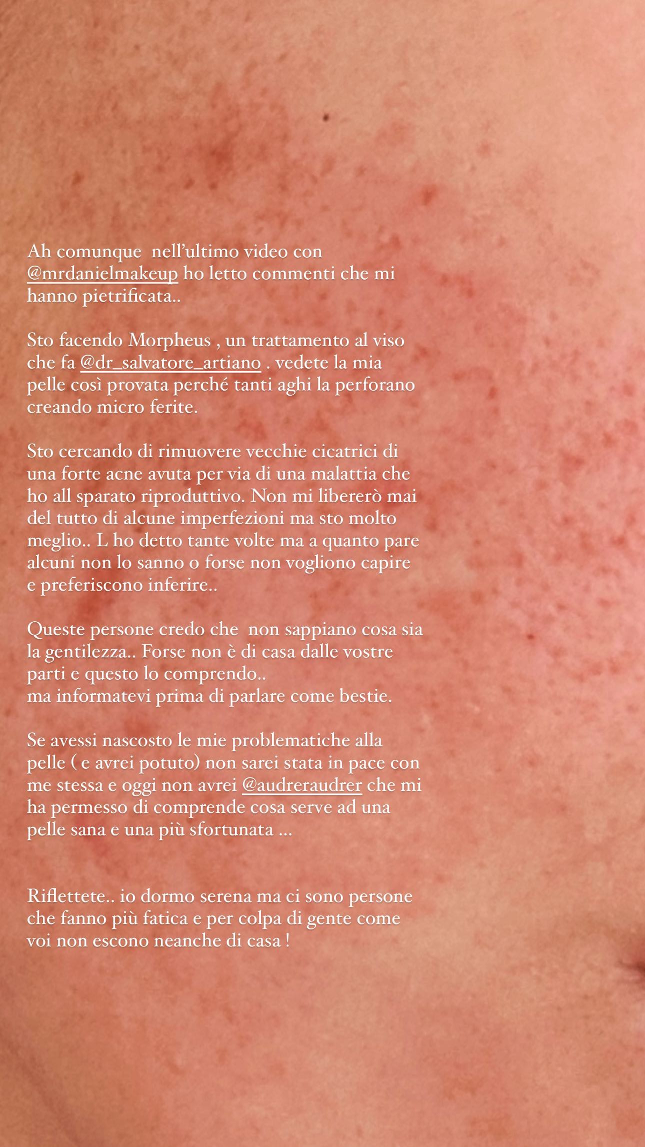 “Queste persone non sanno cosa sia la gentilezza, forse non è di casa dalle vostre parti e questo lo comprendo, ma informatevi prima di parlare come bestie. Se avessi nascosto le mie problematiche alla pelle (e avrei potuto) non sarei stata in pace con me stessa e non avrei oggi la mia linea di prodotti che mi ha permesso di capire cosa serve a una pelle sana e a una più sfortunata”.