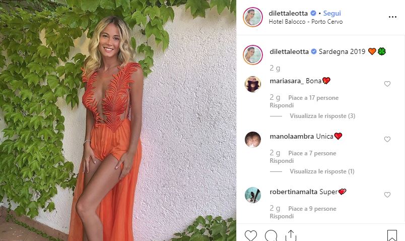 L’ultima immagine condivisa da Diletta Leotta su Instagram la ritrae con un vestito color corallo addosso: ma, nel vestito, solo due “foglie” le coprono il seno.