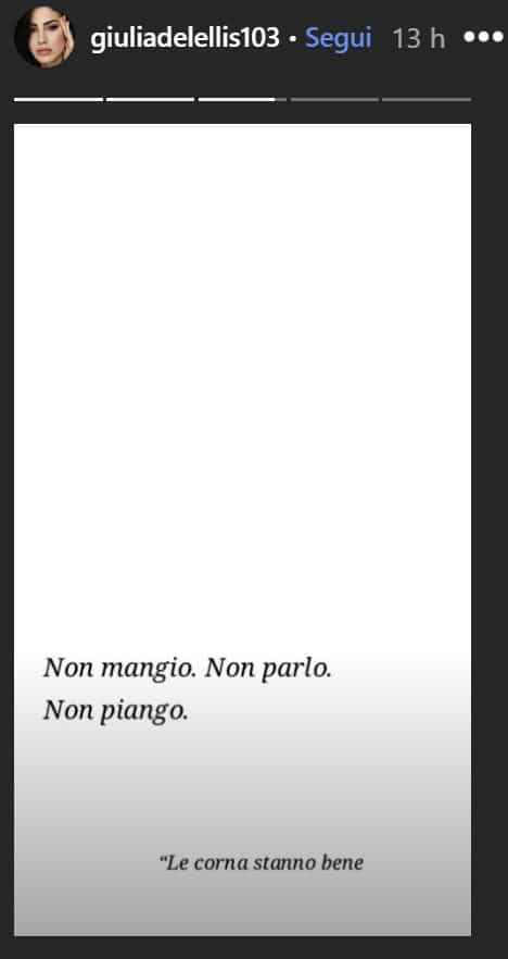 In una delle ultime stories postate sui social, Giulia De Lellis scrive: “Tremo. È aprile, ci sono 24 gradi e io tremo. Ho due felpe e due coperte addosso, la primavera fuori e il gelo dentro. Non mangio. Non parlo. Non piango”.