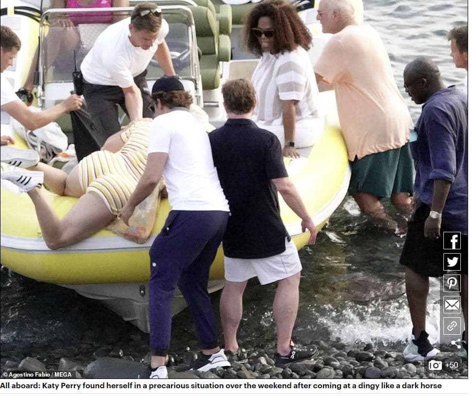 Nelle immagini diffuse dai tabloid britannici si vede la popstar intenta a entrare un po’ imbranata sulla barca, mentre il bel Bradley cerca di spingerla dentro. La scena ha divertito molti, soprattutto la superstar statunitense Oprah Winfrey è stata vista ridacchiare di fronte all’evidente difficoltà di Katy Perry di salire a bordo del gommone.