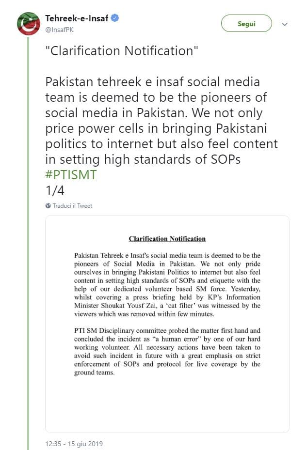 La diretta con le facce da gatto è durata una manciata di minuti. Abbastanza per essere immortalata da tanti e pronta a superare i confini pakistani per fare il giro del web. Subito dopo, i membri dello staff hanno fatto di tutto per correre ai ripari e, sempre sui social, hanno cercato di mettere una toppa, come riportano i media locali.