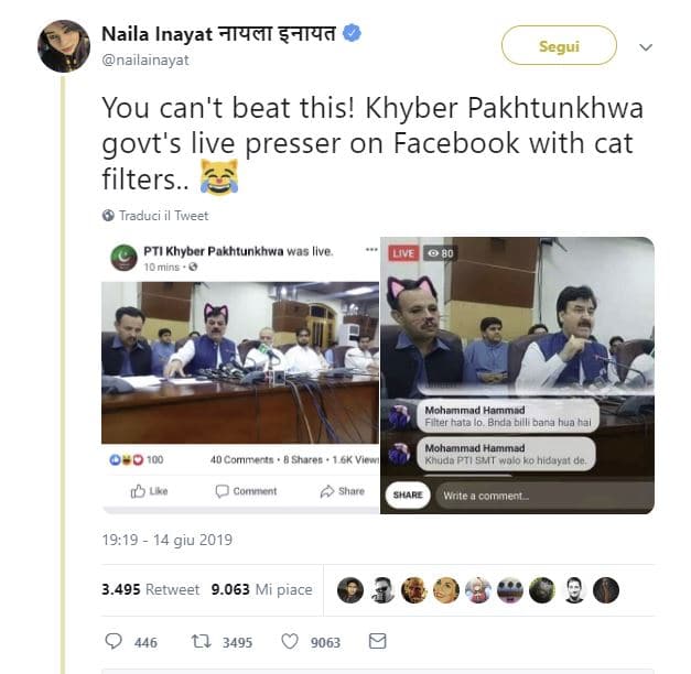 L’incredibile gaffe del governo pakistano: la diretta Facebook con il filtro gatto fa il giro del web