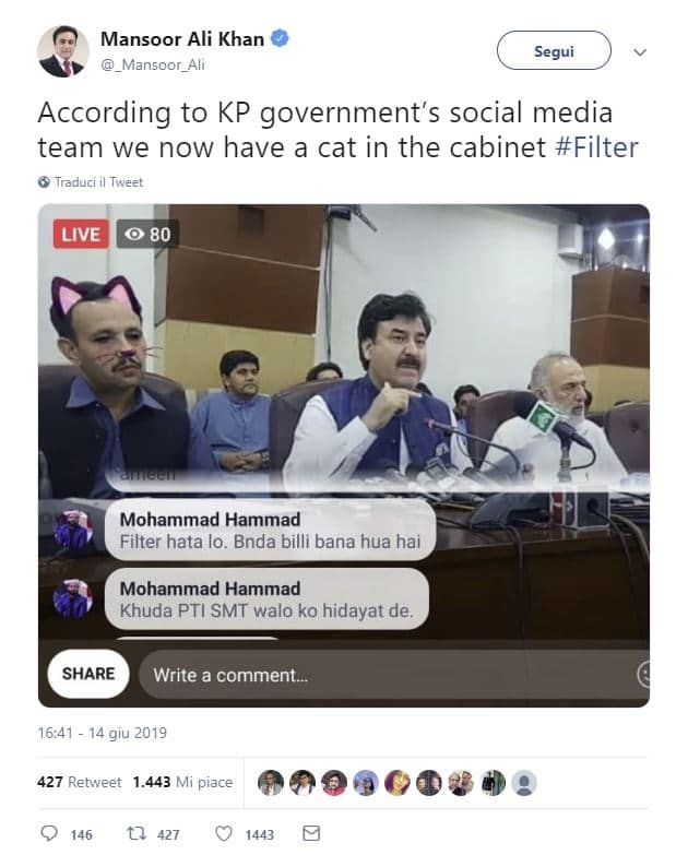 “Tutte le azioni necessarie sono state prese per evitare tali incidenti in futuro”, si legge ancora. I social per il governo sono un mezzo importante e veloce per comunicazioni importanti. Ci tiene alla trasparenza, il governo della provincia pakistana del Khyber Pakhtunkhwa ed è per questo che ha deciso di trasmettere in diretta Facebook quella conferenza stampa. Peccato, però, che qualcuno abbia involontariamente reso quel momento particolarmente esilarante a causa di quel filtro decisamente poco serio.