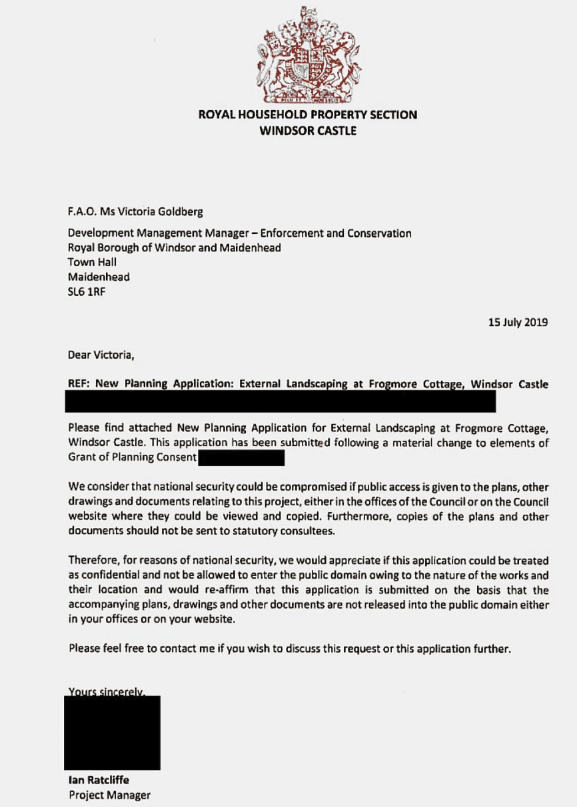Ian Ratcliffe, project manager della Royal Household, ha dichiarato in una lettera al consiglio che i dettagli dei piani della coppia devono essere tenuti segreti.