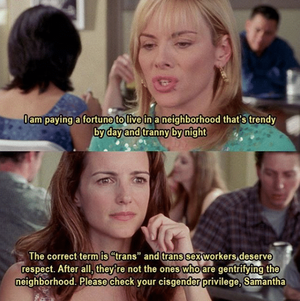 Mentre all’affermazione di Samatha: “Ho pagato una fortuna per vivere in un quartiere che è di tendenza durante il giorno e ‘tranny’ durante la notte”, Charlotte risponde prontamente: “Il termine corretto è trans, e i trans che si prostituiscono hanno bisogno di rispetto. Dopotutto, non sono gli unici ad aver imborghesito il quartiere. Per favore, pensa al tuo privilegio di essere cisgender, Samantha”.